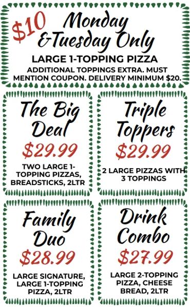Coupons must be mentioned prior to ordering. Tax and delivery extra. Promotions expire 10/31/2024 unless advertised other wise. One coupon per purchase. Coupons can not be applied with any other discounts or promotions. Valid ID required for all alcohol purchases.